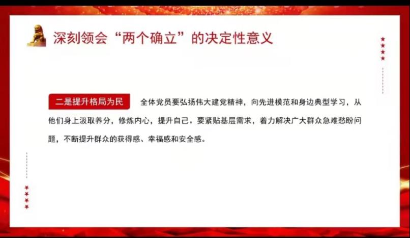 会中,王静怡强调:2022年是党的二十大召开之年,是奋力迈向第二个百年奋斗目标的关键之年。以更加坚定的理想信仰、更为崇高的使命追求、更具扎实的政治作风,迎接党的二十大召开是每一名共产党员的根本要求和重大课题。希望全体党员同志在学习中筑牢红色信仰、夯实红色基因、传承红色精神、保持红色作风,以坚定的信仰、切实的行动、务实的作风迎接党的二十大的到来。