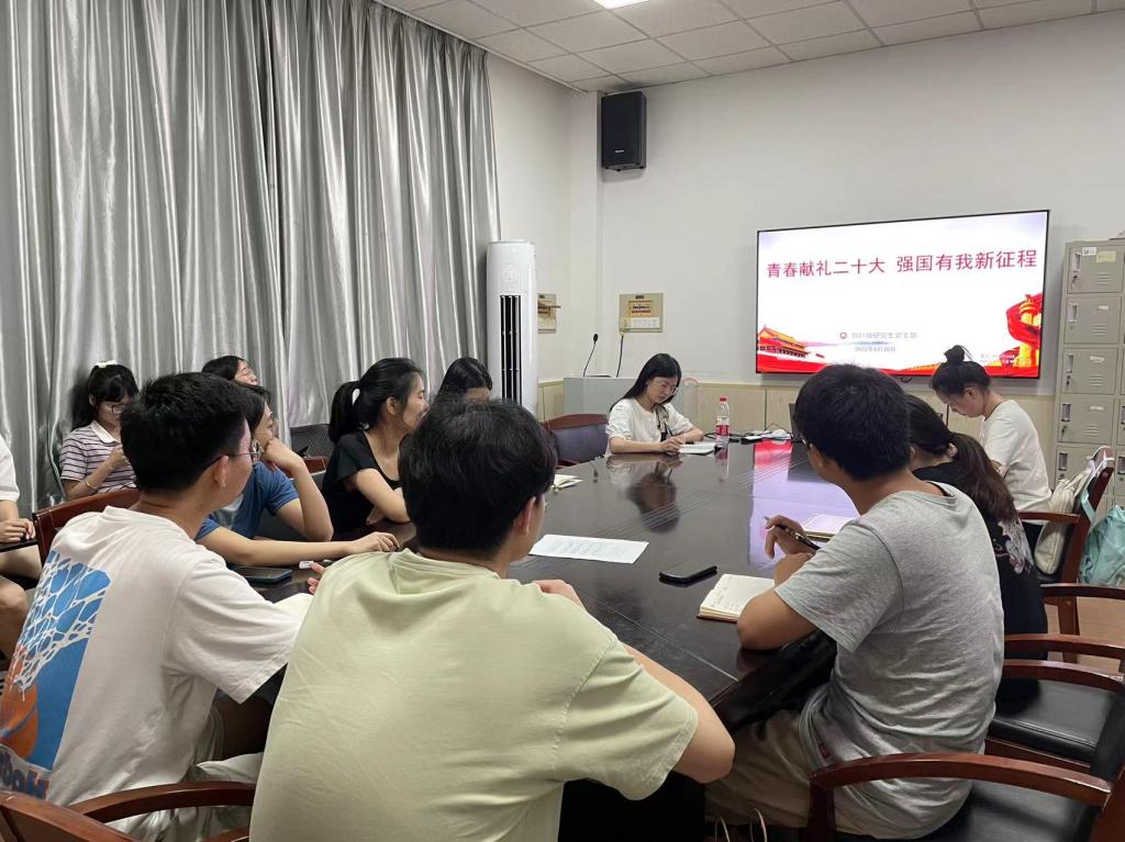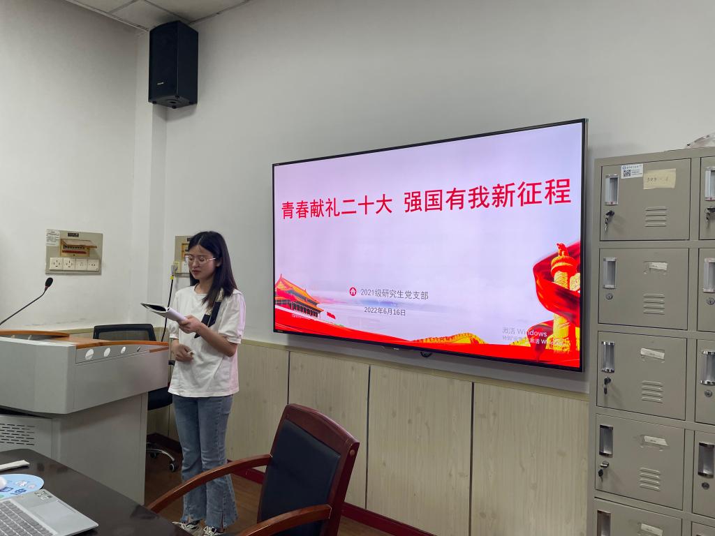 为了以更加振奋的精气神迎接二十大的到来,长沙理工大学马克思主义学院2021级研究生党支部于2022年6月16日晚上7点在4教503教室开展主题为“青春献礼二十大 强国有我新征程”的党课学习,此次党课学习由组织委员吴彩虹主讲。