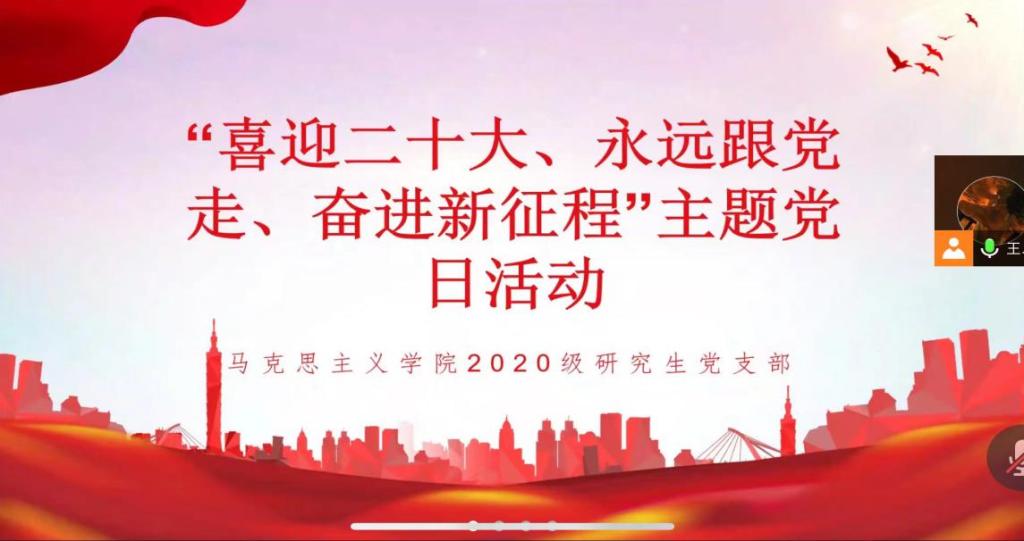 为学习习近平总书记在省部级主要领导干部“学习习近平总书记重要讲话精神,迎接党的二十大”专题研讨班上的重要讲话精神,强化党员身份和使命担当意识,2022年9月28日19时,长沙理工大学马克思主义学院2020级研究生党支部通过腾讯会议开展本月党员大会暨“喜迎二十大、永远跟党走、奋进新征程”主题党日活动。马克思主义学院2020级研究生党支部全体成员参与学习交流,本次专题学习由支部书记王静怡主持。