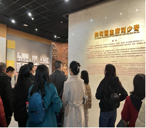 首先,在刘少奇故里管理局宣教部工作人员带领下,老师们整齐列队,庄严肃穆地向刘少奇同志铜像行鞠躬礼,并顺时针绕行铜像一周。刘少奇同志铜像高7.1米,蕴含刘少奇同志享年71岁之意,也蕴涵人民对于刘少奇同志为中国共产党的建设作出卓越贡献的深切怀念和崇高敬意,是中华全国总工会在刘少奇诞辰90周年时赠立。随后,老师们进入刘少奇同志纪念馆参观学习。在优秀讲解员胡老师充满激情而又十分专业的讲解下,老师们边听、边看、边感受,还不时拍照、小声提问和认真讨论,深刻感受刘少奇同志在新民主主义革命时期为党的建设、军队建设、中国工人运动、中华全国总工会的建立、抗日战争和解放战争的胜利、推动实现马克思主义中国化特别是对于毛泽东思想的科学阐释所作的卓越贡献,深入了解刘少奇同志在新中国成立后特别是在社会主义建设时期为发展中国经济、改善人民生活、倡导开展调查研究等等所作的卓越贡献,也深刻领悟刘少奇同志深入群众、联系群众、尊重普通劳动者的优秀品格。在纪念馆参观学习两个多小时以后,老师们还参观了刘少奇同志故居,聆听了刘少奇同志为了开展调查研究曾连续在故居居住6天6夜、召开座谈会并把部分房间分给当地无房农民居住的感人故事。