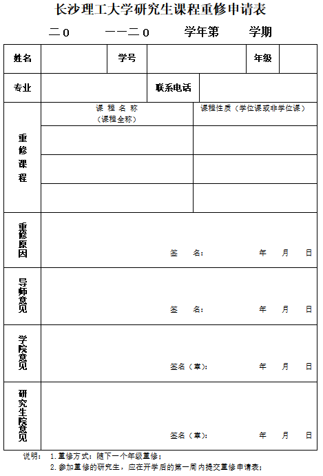 长沙理工大学研究生课程重修申请表