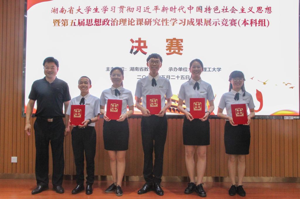 2019年5月25日,湖南省大学生学习贯彻习近平新时代中国特色社会主义思想暨第五届大学生思想政治理论课研究性学习成果展示竞赛本科组决赛在长沙理工大学顺利举行。由马克思主义学院郭华老师指导的,来自电气工程学院的五名学生谭艳,王沛缘,陈烊文,高林生,罗恒组成学习小组代表学校参加决赛,其作品《新时代理工科大学生工匠精神的培育与践行研究》喜获一等奖。