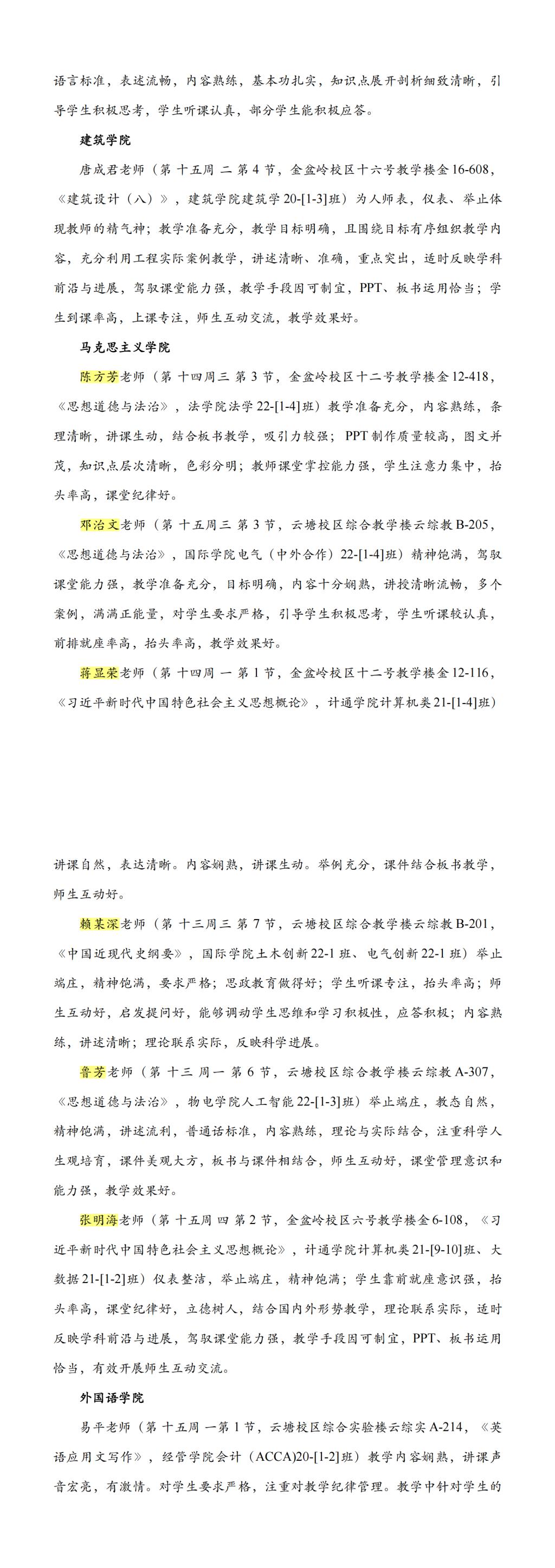 6月30日,长沙理工大学发布《本科教学督导信息》(23年第三期)简报。我院张明海、陈方芳、邓治文、蒋显荣、赖某深、鲁芳等六位教师获推长沙理工大学“课堂教学优秀典型”。
