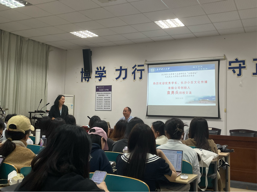 为帮助同学们在今后的生涯规划中明确目标、把握时机,长沙理工大学马克思主义学院于5月22日晚八点在云塘校区文科楼C202举办第十五届研究生“云影讲坛”暨职业与人生大讲堂——读博就业分享会。本次活动由辅导员曾蓓老师主持,优秀学长、长沙小百文化传播有限公司创始人袁勇兵受邀主讲,马克思主义学院2022级全体研究生参加。