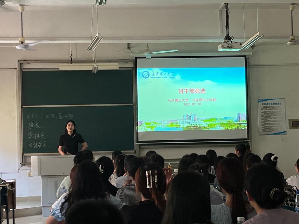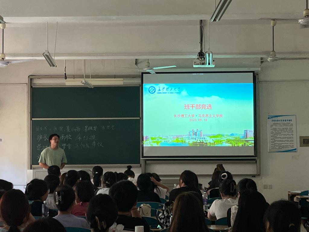 本次班会分为辅导员讲话、班委竞选、院研会招新宣传三个环节有序进行。首先,曾老师对2023级研究生新生的到来表示热烈欢迎。接着,曾老师给新生提出了三点希望。一是遵守纪律,踏实走稳校园学习生活;二是认真学习,扎实训练科研能力;三是积极参加各类活动,提高自身的综合素养。随后,曾老师着重强调了研究生校园学习生活基本规范。第一,就寝方面。同学们要严格按照制度就寝,注意用电安全、留意关门时间,及时回寝。第二,请假方面。同学们如若外出或外宿请务必与导师、曾老师报备并走请假流程;第三,出席活动方面。同学们尽量提前5-10分钟到场,如有特殊情况请提前和曾老师请假。第四,信息沟通方面。同学们要关注马克思主义学院的微信公众号与班级群,及时获取最新动态。在日常学习和生活中如果遇到困惑,欢迎大家与曾老师交流和沟通。