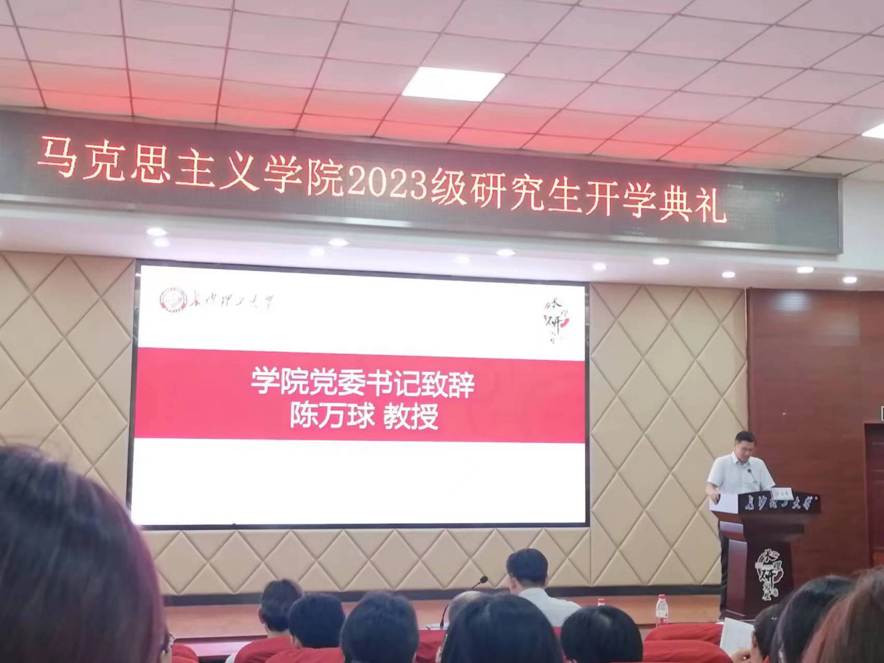 典礼伊始,张明海院长对2023级研究生新生的到来表示热烈的欢迎,并简要介绍了出席典礼的各位领导和老师们。典礼第一项,奏唱国歌。在全体师生整齐而响亮的歌声中,开学典礼正式拉开序幕。典礼第二项,学院党委书记陈万球致辞。陈书记热烈欢迎新生们来到马克思主义学院,并正式开始研究生三年的求学之路,并简要介绍了我院深厚的历史底蕴。同时,他也对新同学们提出了三点希望:第一,共同经受马克思主义的洗礼。同学们要坚定马克思主义的理想信念,坚持用马克思主义基本原理指导实践,这也是新时代马院学子的使命和担当。第二,共同营造我们新的命运共同体。马克思主义学院是名师荟萃的殿堂,是大家放飞梦想的舞台。同学们要秉持着“博学、力行、守正、拓新”的校训,书写属于自己的青春华章。第三,共同捍卫学术道德。陈书记指出,同学们必须要遵守学术规范及行为准则。在科研道路上要秉承着务实、严谨、创新的学术态度,脚踏实地、稳扎稳打地开拓自己的学术道路。