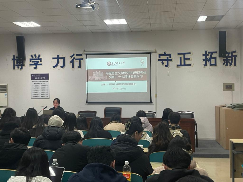 为深入学习宣传贯彻党的二十大精神,增强对学生的价值观引领,2023年12月14日晚7:00,马克思主义学院于云塘校区文科楼C202开展新生入学教育系列之党的二十大精神专题学习。本次宣讲会邀请到长沙理工大学研究生宣讲团团长王梦婷进行题为《凝心聚力掣画新蓝图,团结奋斗创造历史新伟业》的宣讲,由学院辅导员曾蓓主持,2023级全体研究生参加。