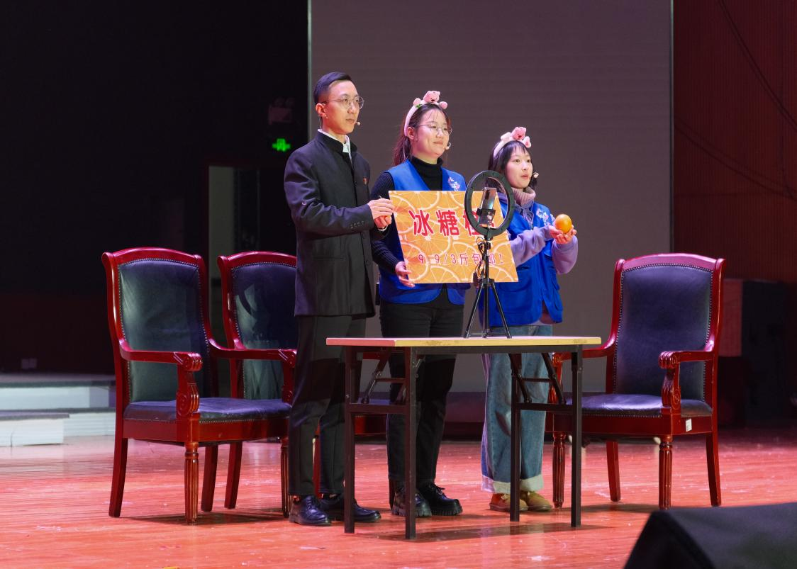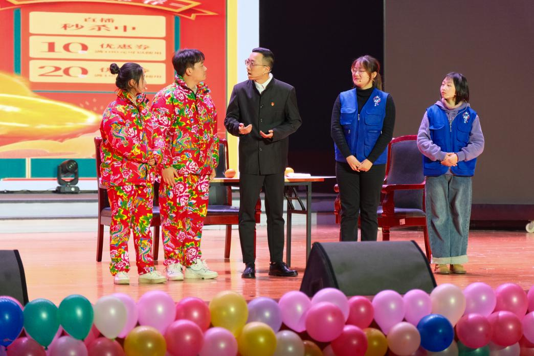 本次晚会以“心连新,梦飞young”为主题,在这次晚会中,马克思主义学院为大家带来了一出情景剧节目《志智双扶促振兴》。在表演过程中,扮演者们用惟妙惟肖的模仿和生动幽默的语言,三翻四抖、包袱不断,捧哏逗哏、默契配合,台下的观众在欢笑中获得共鸣,掌声雷动。