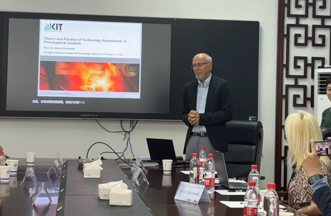 4月27日下午,德国卡尔斯鲁厄理工大学(Karlsruher Institut für Technologie /KIT)Armin Grunwald教授来到马克思主义学院,在雷竞技官网云塘校区文科楼B602会议室作了题为“技术评估理论与实践的哲学分析”的学术讲座。本次讲座由马克思主义学院文贵全副院长主持,余乃忠教授、陈芬教授、蒋显荣教授、廖苗副教授、郭蓉博士等学院部分教师和马克思主义学院2023级哲学、公共管理专业研究生近50人聆听了讲座。此外,广西科技大学黄磊助理教授也参加了本次讲座。