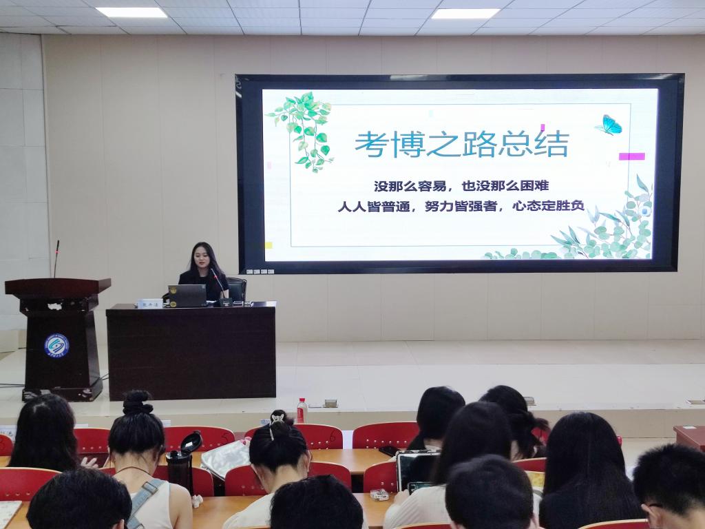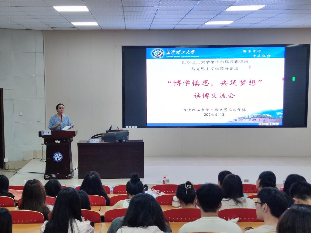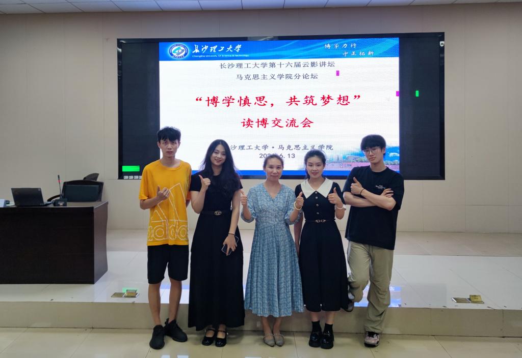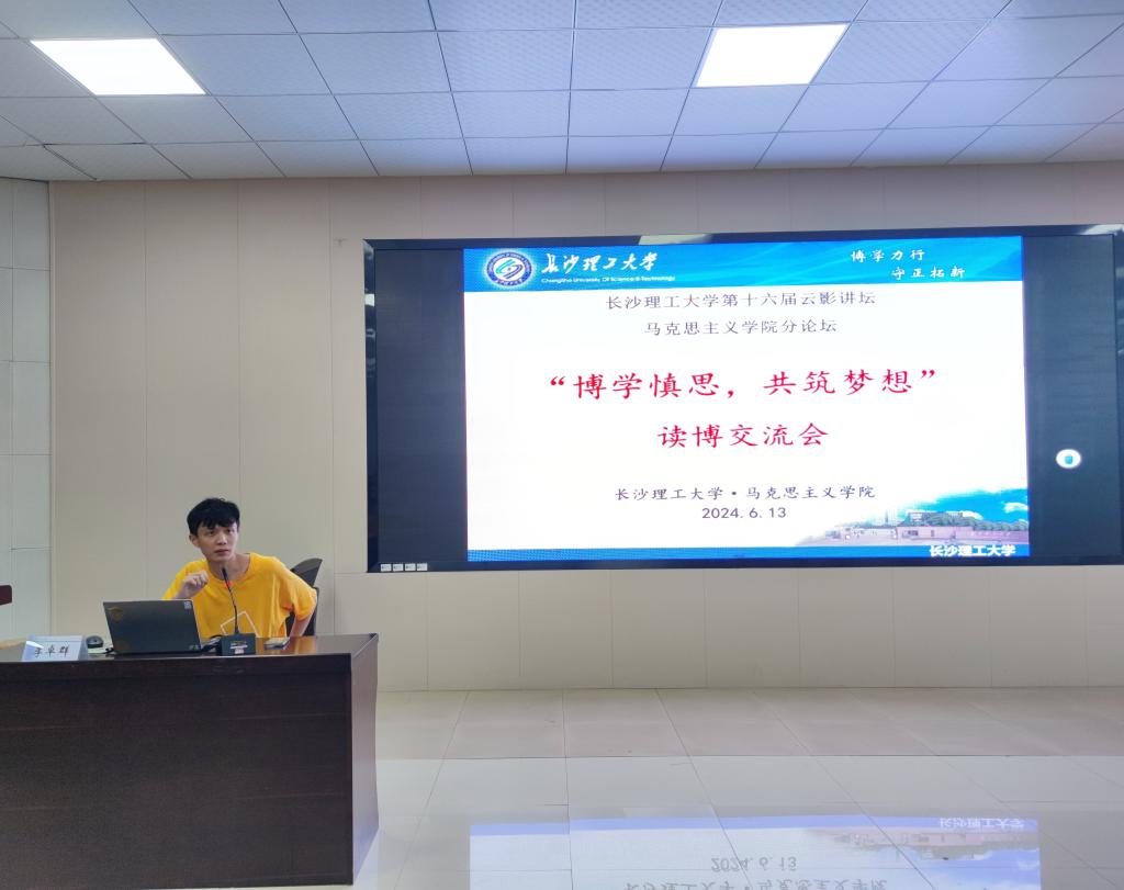 2024年6月13日晚,长沙理工大学第十六届云影讲坛之马克思主义学院分讲坛“博学慎思,共筑梦想”读博交流会在云塘校区文科楼A100举行。本次交流会由2023级研究生梁水薇主持,学院辅导员曾蓓及全体在校研究生参加。特别邀请了四位优秀的2021级哲学专业研究生谢添翼、付圣莹、李卓群、张卉洁担任主讲嘉宾,分享他们的考博经验与心得。
