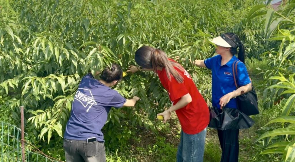 实践团成员走入金色桃海。“我们基地种了10多个品种的桃子,它们分批成熟。这片黄桃刚下树,那片还是小毛桃的是10月份秋桃……”企业负责人带领实践团成员走入350亩金色桃海,看桃树、摘桃子、品桃子。负责人介绍,桃子“种植周期短、挂果出品快”,金色桃海不断优化种植技术,特别注重绿色生态,积极融合文旅,打造了“三月桃花节”“中小学校研学基地”等,在实现企业增收的同时赋能乡村文化发展。