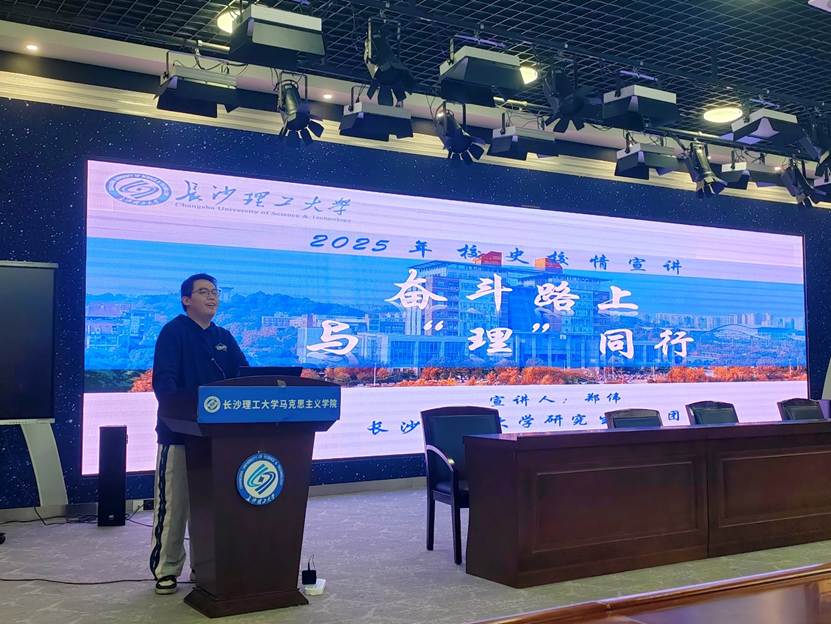 2025年10月30日下午4:00,以“奋斗路上,与‘理’同行”为主题的2025级研究生校史校情宣讲会,在云塘校区文科楼B300报告厅开展。此次宣讲会由长沙理工大学研究生宣讲团承办,研究生宣讲团成员郑伟主讲,马克思主义学院全体2025级研究生参加。