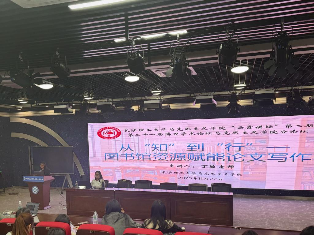 2025年11月27日下午2:30,长沙理工大学马克思主义学院“云霞讲坛”第二期暨第二十一届博力学术论坛马克思主义学院分论坛在云塘校区文科楼B300报告厅顺利举行。本期讲坛特邀马克思主义学院青年教师丁敏博士担任主讲嘉宾,由马克思主义学院研究生会学研部陈婷婷主持,马克思主义学院学工办主任曾蓓、2025级全体研究生及2024级部分研究生参加。