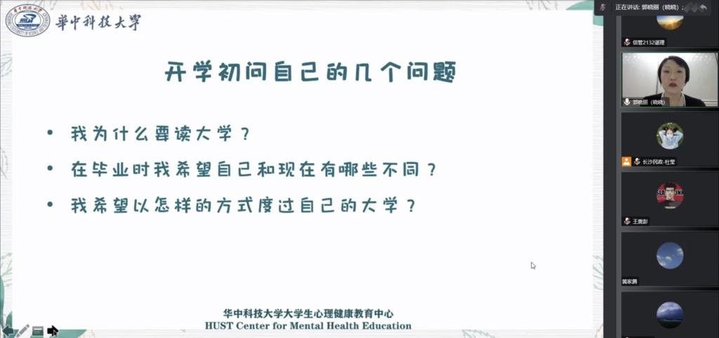 2022年10月13日晚19:30,长沙理工大学马克思主义学院组织2021级全体研究生观看大学生心理健康讲座。此次讲座是由华中科技大学心理健康教育中心副主任、专职咨询师、中国心理学会注册心理师郭晓丽主讲,以线上讲座的形式为大家带来本年度秋季成长大讲堂第一场《大学新生心理适应》。