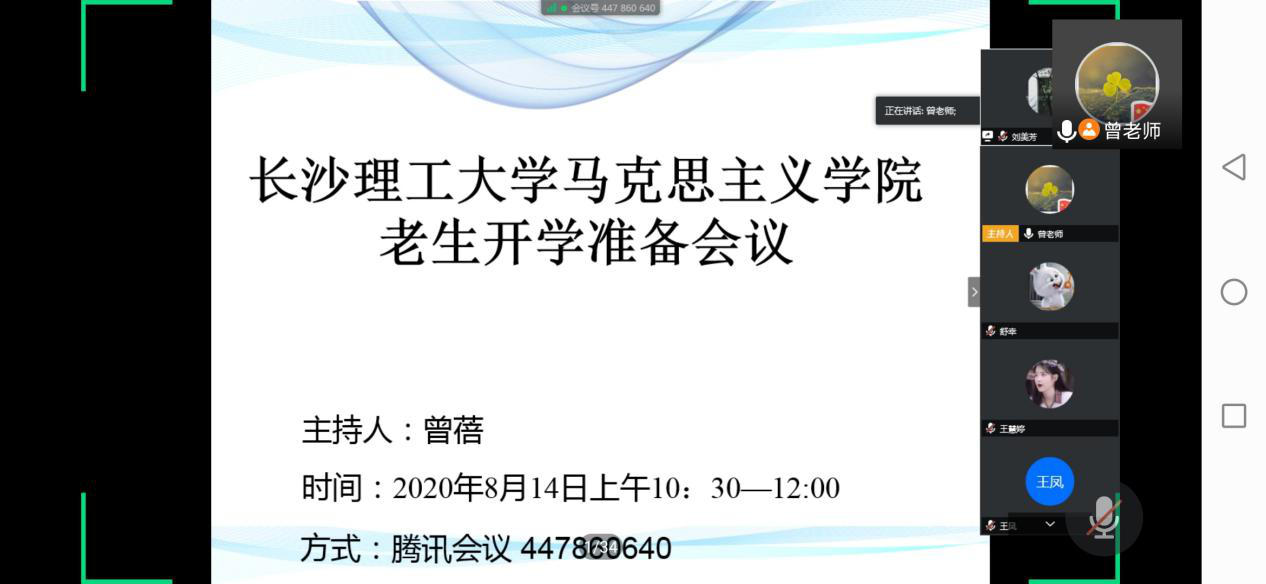 为更好落实2020年秋季学期研究生开学返校、校区搬迁及返校后日常管理工作,辅导员曾蓓老师于2020年8月14日上午10:30在腾讯会议上给2018级和2019级全体同学开了一次详细的班会,会议按照长沙理工大学秋季返校事项通知并考虑到全体同学的健康安全等各个方面。