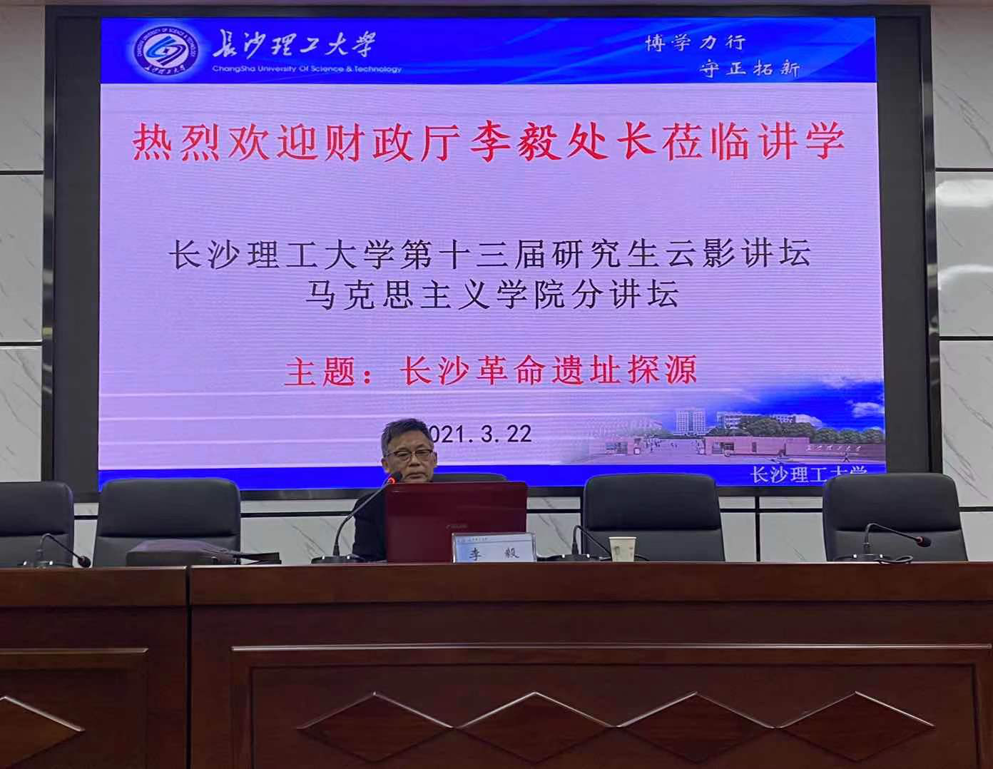 3月22日下午8时30分,长沙理工大学第十三届研究生云影讲坛马克思主义学院分讲坛之“长沙革命遗址探源”在金盆岭校区4教1楼报告厅举行,湖南省地方志编委、湖南省财政厅处长、高级经济师李毅受邀主讲。此次讲座由马克思主义学院辅导员曾蓓主持,马克思主义学院傅如良教授和2020级研究生参加此次讲座。