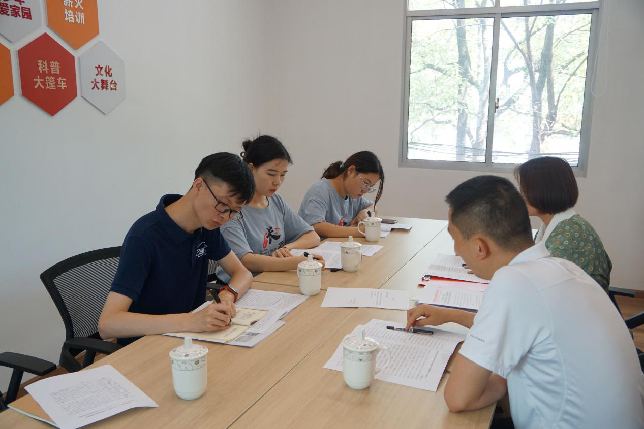 随后,成员们步行抵达望城区新时代文明实践中心,与区新时代文明实践中心负责人王丽华、区委宣传部(文明办)学雷锋志愿服务科科长刘玉明进行深入的访谈交流。首先,中心负责人带领团队成员参观并解说了文明实践中心的宣传展示馆、雷锋讲堂、志愿者礼遇区等,团队成员了解到望城区文明实践活动以“金种子行动”带动全局,从而在人们心中传播思想、精神、文明、文化、法治的种子,团队成员针对望城特色时而详细询问相关内容,时而探寻活动本质,力求基本掌握真实情况。其次,在中心会议室里召开了调研座谈会,刘玉明为团队成员介绍了前期望城区新时代文明实践中心建设工作情况、区新时代文明实践工作存在的问题和不足、全区下一阶段文明实践工作计划等内容。团队成员仔细聆听,认真记录重要内容。团队负责人周勇对团队和此次调研目的做了基本说明,并应王丽华邀请,交流了前期暑期实践的调研心得和实践收获。成员侯颖对全区文明实践活动的实际开展情况、“志愿望城”小程序和“云上望城”APP使用情况、“两个中心”融合建设等问题进行了重点提问并交换了想法。成员张子豪针对望城区各村社利用好“金种子广播”宣传党的理论知识、讲述雷锋故事等整体细节深入询问,希望能对乡村宣传政策理论打通最后一米的经验做法进行总结。