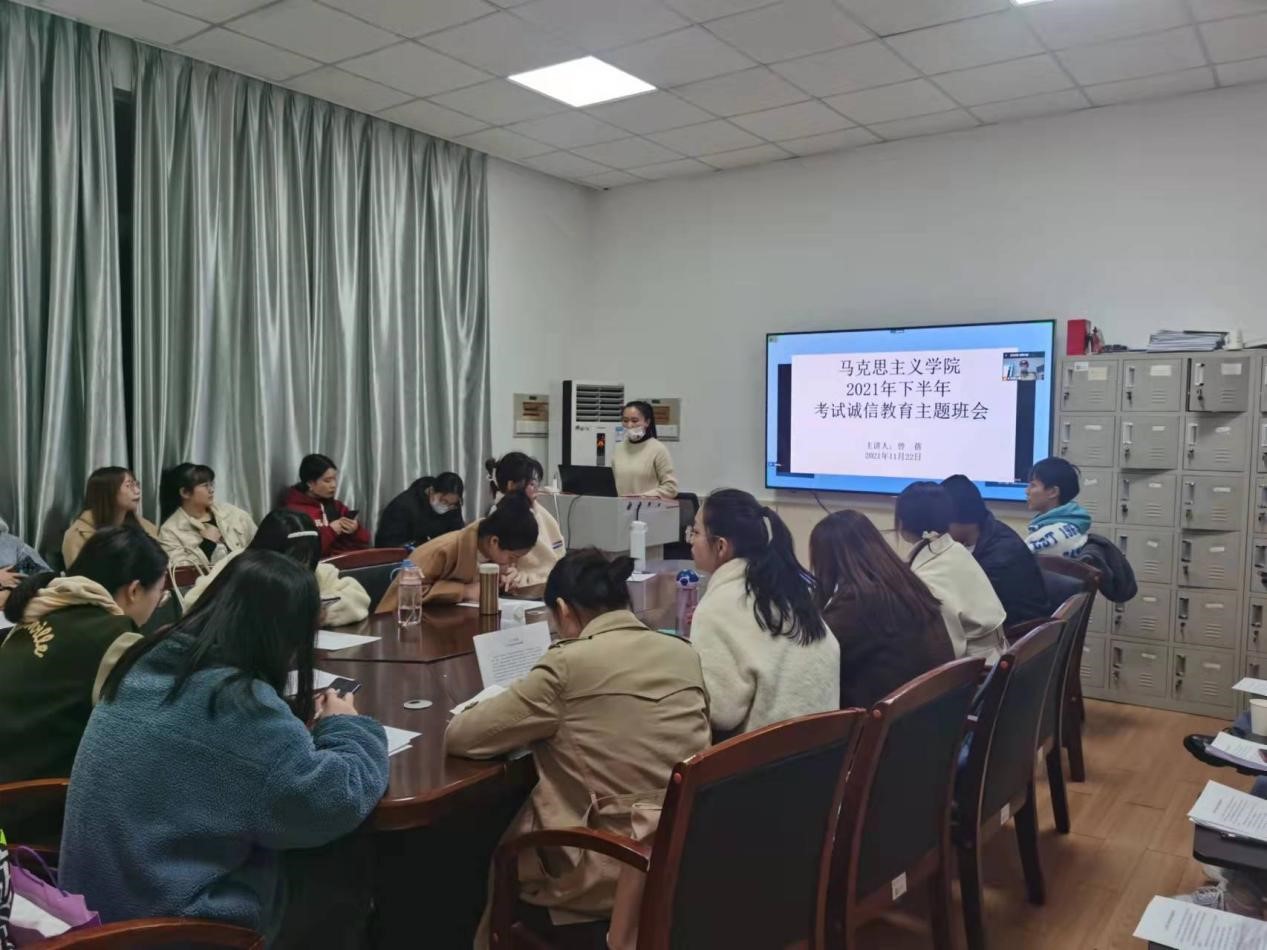本学期研究生考试即将陆续展开,为严肃考风考纪,有效防范考试作弊现象发生,2021年11月22日晚7:00,马克思主义学院采取线上线下相结合的方式组织召开了考风考纪教育主题班会,学院全体研究生参加。会议由辅导员老师曾蓓主持,会议主要从传达《关于加强研究生考风考纪教育工作的通知》精神、重新学习各项考试违纪违规处理办法以及签署诚信考试承诺书三个环节展开。