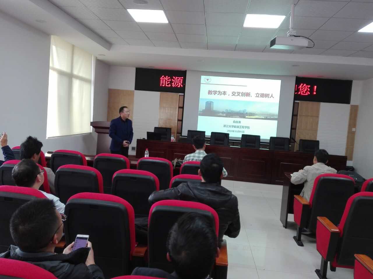 11月1日,浙江大学能源工程学院副院长,中国高等教育学会工程热物理专业委员会理事,教育部高等学校能源动力类专业教学指导委员会副秘书长,全国大学生节能减排社会实践与科技竞赛委员会秘书长俞自涛教授受邀,在新能源大楼能动学院会议室作“教学为本,交叉创新、立德树人”的讲座。学院副院长刘亮、副院长鄢晓忠、教务办主任和40多位专业教师共同参加了此次活动。