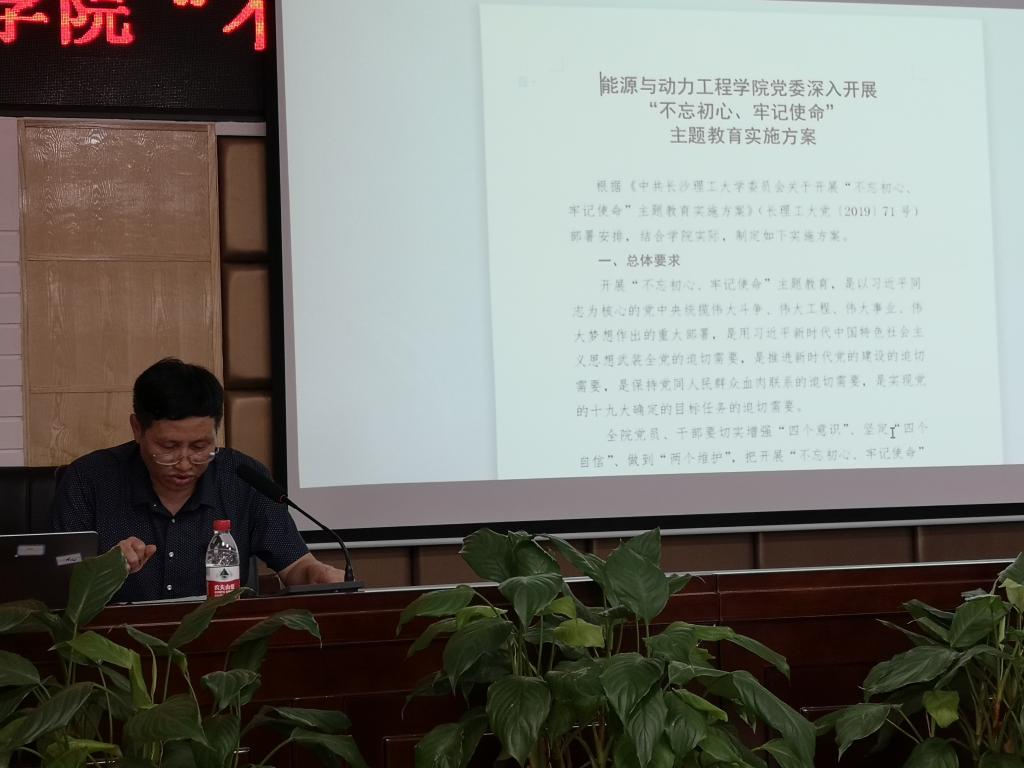 专职组织员王汉华宣讲了《能源与动力工程学院深入开展“不忘初心、牢记使命”主题教育实施方案》,从总体要求、工作安排、组织保障三个方面进行部署,从认真学习研讨、开展调研、专题党课、广泛听取意见、深刻检视反思、专项整治、整改落实、专题民主生活会等方面进行具体工作的安排。