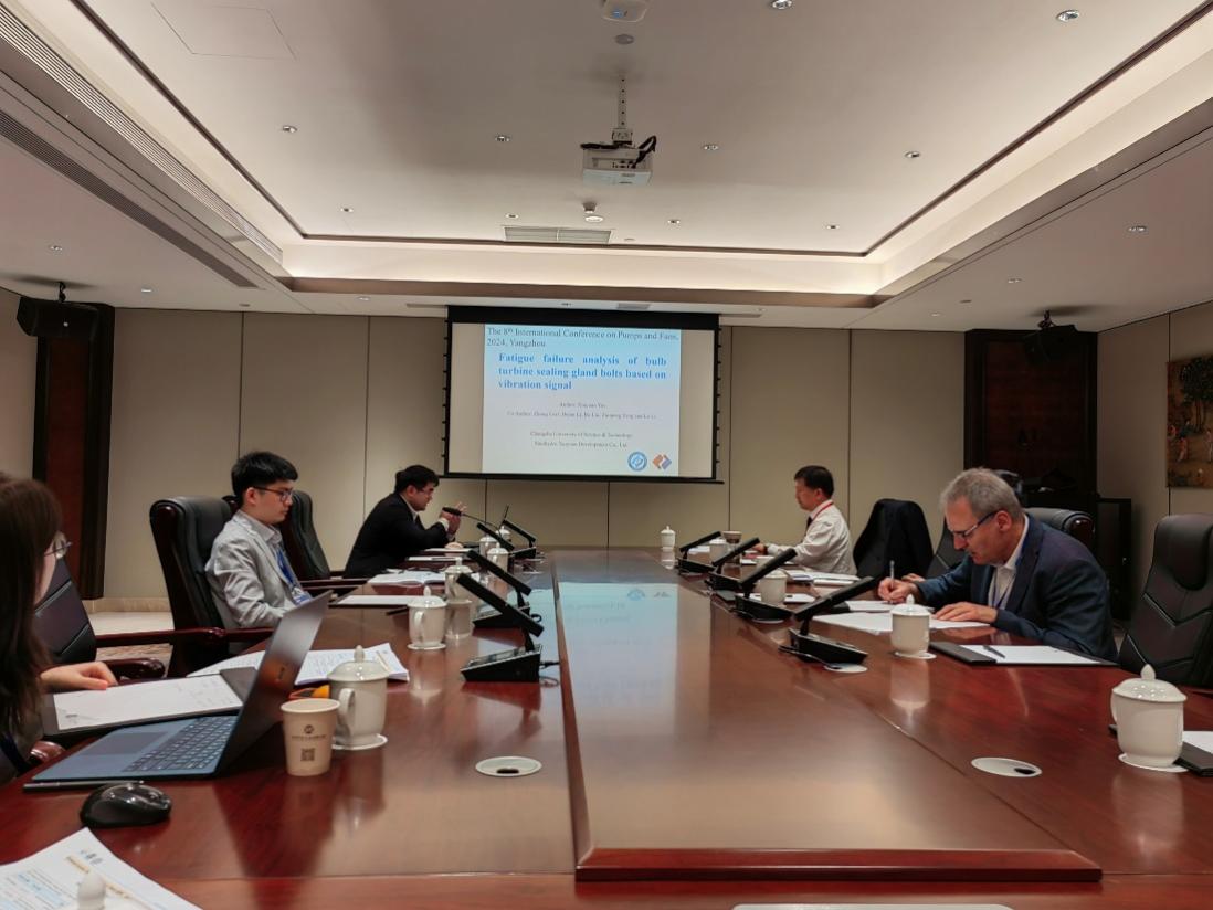 会议开幕式由扬州大学水利科学与工程学院院长成立主持,扬州大学党委书记焦新安、江苏大学国家水泵及系统工程技术研究中心主任袁寿其、清华大学热能工程系教授祝宝山分别在开幕式致欢迎辞。来自德国莱茵普福尔茨-凯泽斯劳滕-朗道工业大学、日本早稻田大学、韩国海洋大学、西安交通大学、清华大学、日本大学、韩国国立木浦大学、日本东北大学、尼泊尔加德满都大学、扬州大学的10位专家学者先后作大会特邀报告,5个分会场进行了132场学术报告。我院研究生尹昕元在分会场作了《Failure analysis and treatment of sealing gland bolts for bulb turbine expansion joints》和《Fatigue failure analysis of bulb turbine sealing gland bolts based on vibration signal》两场学术报告,详细介绍了课题组承担的灯泡贯流式水轮机伸缩节密封压盖关键部件技术研究工作,受到与会同行的关注和好评。会议期间,我院师生还与参会同行交流了近些年开展的科学研究、技术开发和人才培养情况,获得了有关专家学者的建议和启示。