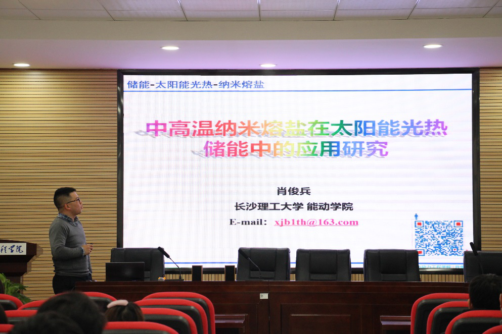 第一部分,由肖俊兵博士带来了题为“中高温纳米熔盐在太阳能光热储能中的应用研究”的报告。
