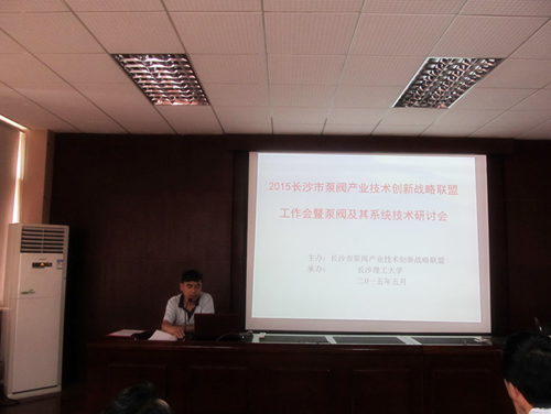 2015年5月22日上午,长沙市泵阀产业技术创新战略联盟工作会暨泵阀及其系统技术研讨会在长沙理工大学云塘校区召开。此次会议由长沙市泵阀产业技术创新战略联盟主办,长沙理工大学流体机械及工程学科团队承办。出席会议的25名代表来自长沙市科技成果转化服务中心、湖南湘电长沙水泵有限公司等15个泵阀及系统相关单位。会议由李志鹏教授主持,长沙理工大学科学研究部副部长李岳林教授致欢迎词。中阀科技(长沙)阀门有限公司总工程师童成彪做了2014年技术创新专题报告,长沙佳能通用泵业有限公司陈芳芳、长沙理工大学刘忠副教授、硕士研究生杨建文等进行了课题汇报演讲。与会代表广泛而深入地展开了技术交流。