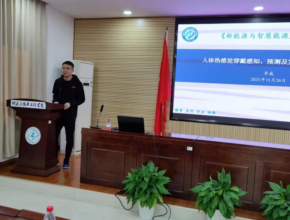 李威作题为《人体热感觉穿戴感知、预测及室温智能调控方法》的报告。他从工程背景和生活背景为切入口,提出了人体热感觉的预测模型和基于人体热感觉穿戴传感的室内温度优化调控方法,并且讲解了利用修正算法解决模型精确性的问题。