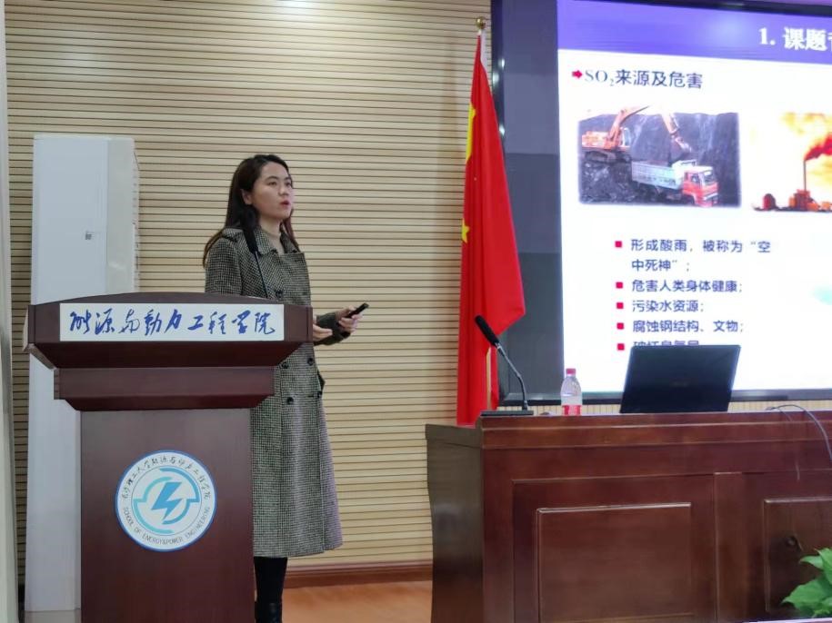 宣艳妮作题为《锰基脱硫剂化学链烟气脱硫》的报告。她首先介绍了SO2的来源及危害,之后讲述了工艺参数对锰基脱硫剂性能的影响,最后针对烟气中脱除SO2及资源化回收利用方面的研究内容进行了详细的讲解。