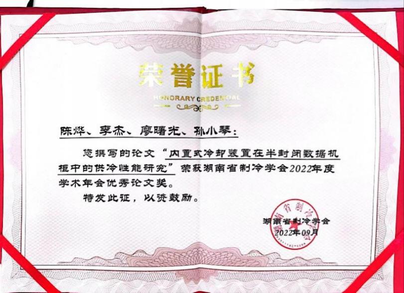 本届大会以“健康生活 低碳节能”为主题,围绕制冷空调行业新技术开展探讨。中国科学院理化技术研究所田长青研究员和湖南大学曹静宇副教授分别以“高品质安全低碳冷链体系构建”和“制冷系统优化及能量回收”为题做了大会报告。会议宣读并颁发了优秀工程奖、产品技术进步奖、优秀论文奖等奖项,我院研究生陈烨撰写的论文“内置式冷却装置在半封闭数据机柜中的供冷性能研究”获得优秀论文奖。
