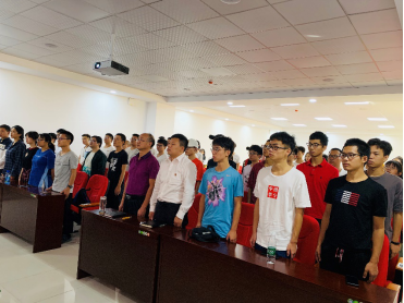 上午7:00的图书馆前坪,沐浴着朝阳,全体师生整装肃立。国旗班的成员迈着整齐的步伐,护送着五星红旗进场。在庄严雄壮的国歌声中,鲜艳的五星红旗冉冉升起,全体师生高唱国歌并向国旗行注目礼。仪式后,师生一齐挥舞着手中的五星红旗,深情地唱响《我和我的祖国》。“能人辈出,动力十足!祖国万岁!祝祖国繁荣昌盛!”嘹亮的口号响彻整个校园。