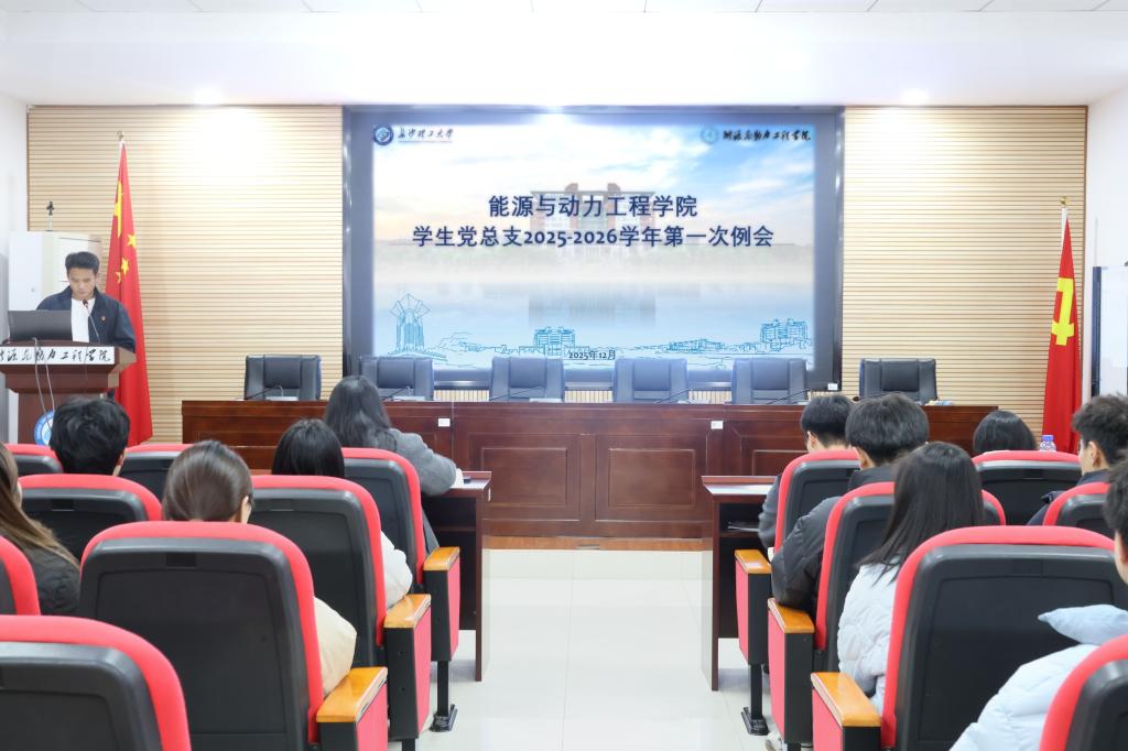 12月25日晚,能源与动力工程学院学生党总支2025-2026学年全体例会在新能源大楼二栋502会议室召开。会议由党总支副书记龙敦建主持,学院党建辅导员罗亦欧和学生党总支全体成员参加本次活动。