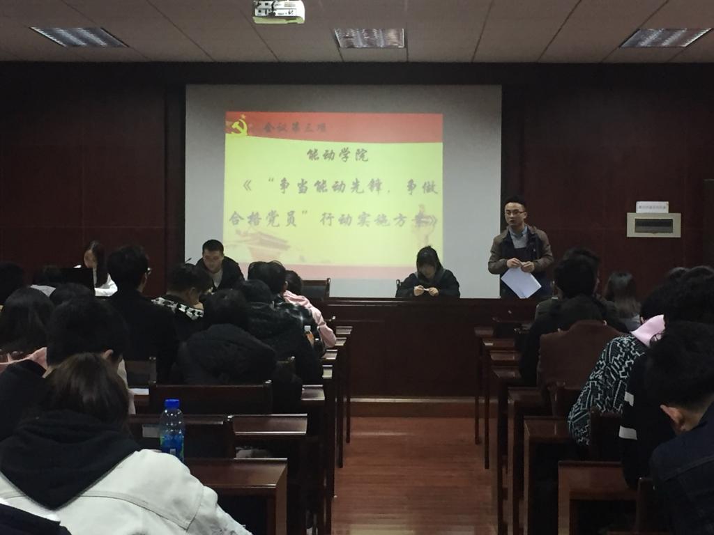 大会在庄严的国歌下拉开序幕,学生党总支副书记刘泽良解读《能动学院2018年学生党建工作要点》,并对以后需开展的各项工作进行了认真的部署,各位党员同志都从中明确自己的目标,找准自己的努力方向。其后,学生党总支纪检委员李文豪强调党员同志们应切实发挥党员先锋模范作用,争当能动先锋,争做合格党员,不忘初心,积极进取,做一名优秀的共产党员,总结2017年的成果才能更好展望2018,紧接着学生党总支组织委员谢为宣读《2017年度民主评议考核结果》,对优秀党员提出表扬,对考核不合格党员也提出批评,希望各位党员同志们能向优秀看齐,不断地提升自我,从生活,学习各个方面完善自我。