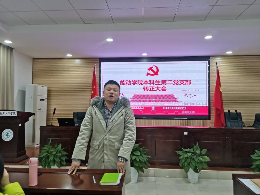 12月16日晚6点半,能动学院本科生第二党支部在新能源大楼502教室开展转预备大会暨转正大会。本科生第二党支部书记彭博与会,第二支部全体党员同志参与本次会议。