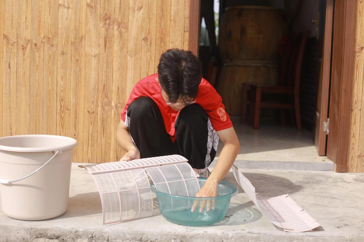 切断电源,用湿抹布擦洗外壳上的灰尘;打开面板,将滤网轻轻提起取出;清洗滤网,冲洗上面的灰尘并擦拭干净……队员们熟练地进行着清洗空调的每一个步骤,认真细致地将滤网上的灰尘冲洗干净。你来取网、我来清洗、他来安装,在队员们的合力协作下,一家又一家的空调维保得以完成。