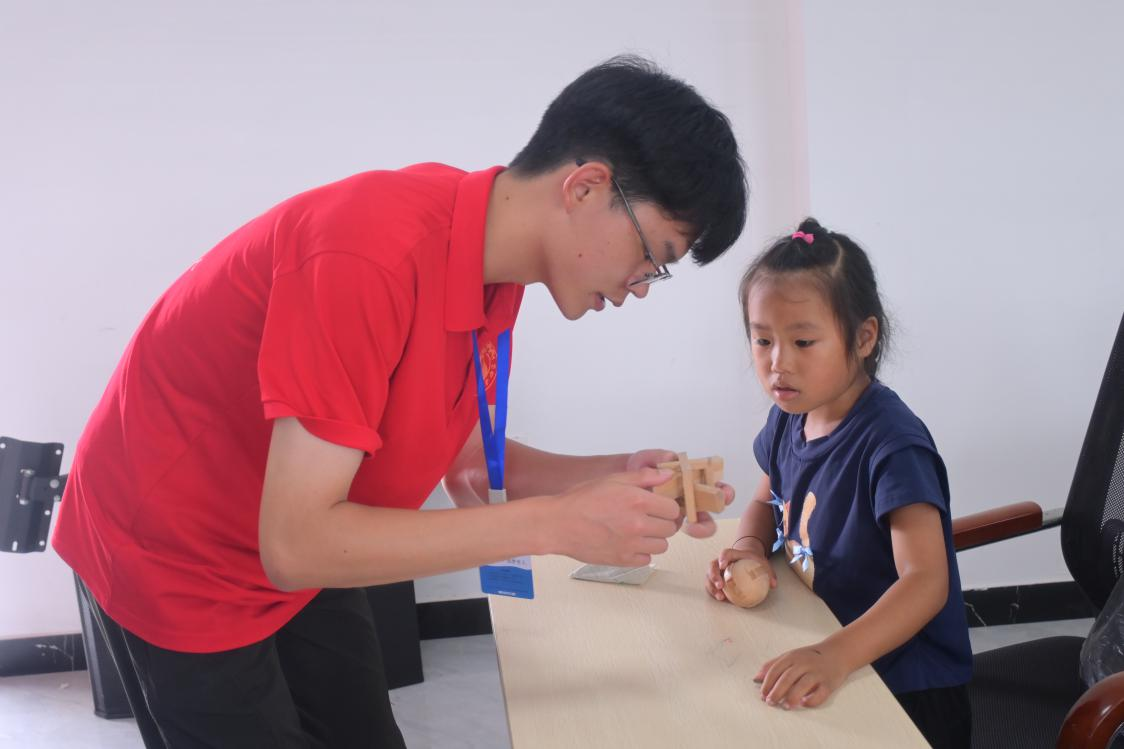 动手环节,志愿者给孩子们分发了小巧的鲁班锁——这正是榫卯工艺的“微缩模型”。“先找最松的那根!”罗中杰手把手示范,“你看这根木条侧面有个小凸起,对应的那根有个凹槽,按住凸起往外抽试试?”孩子们盯着手中的六根木柱,有的蹙眉观察,有的试着旋转,忽然有人喊:“动了!”一根木条带着轻微的“咔”声抽出,剩下的结构顿时松动。大家顺着榫卯咬合的痕迹拆解,有的按住横向木柱抽出纵向的,有的发现某根木条的凹槽能顺着另一根的凸起滑动,指尖在木块间摸索、试探,偶尔碰到卡住的地方,便对着同伴的成功案例琢磨。在拆拆拼拼间,孩子们亲身体验着“榫”与“卯”严丝合缝的奇妙。