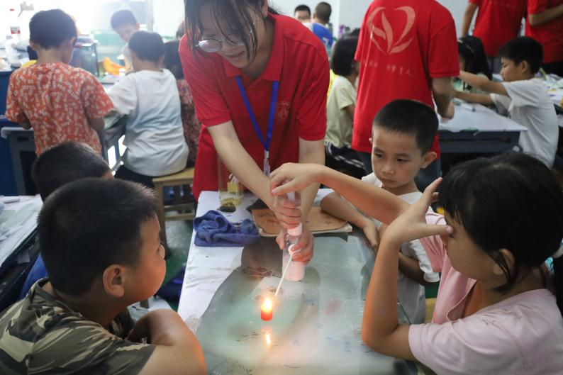 在实验环节,王贺带领孩子们走进科学魔法秀,模拟泡沫灭火器原理,制作一个简易小灭火器,让孩子们做一回“小小消防员”。当小苏打与柠檬酸发生化学碰撞,孩子们将小灭火器产生的二氧化碳气体将小蜡烛的火扑灭时,教室内发出阵阵惊叹,“原来灭火器里藏着这么酷的科学!”,他们在直观感受科学灭火奇妙的同时,也对灭火器的灭火原理有了更深刻的认识,把科学探索的热情拉满。