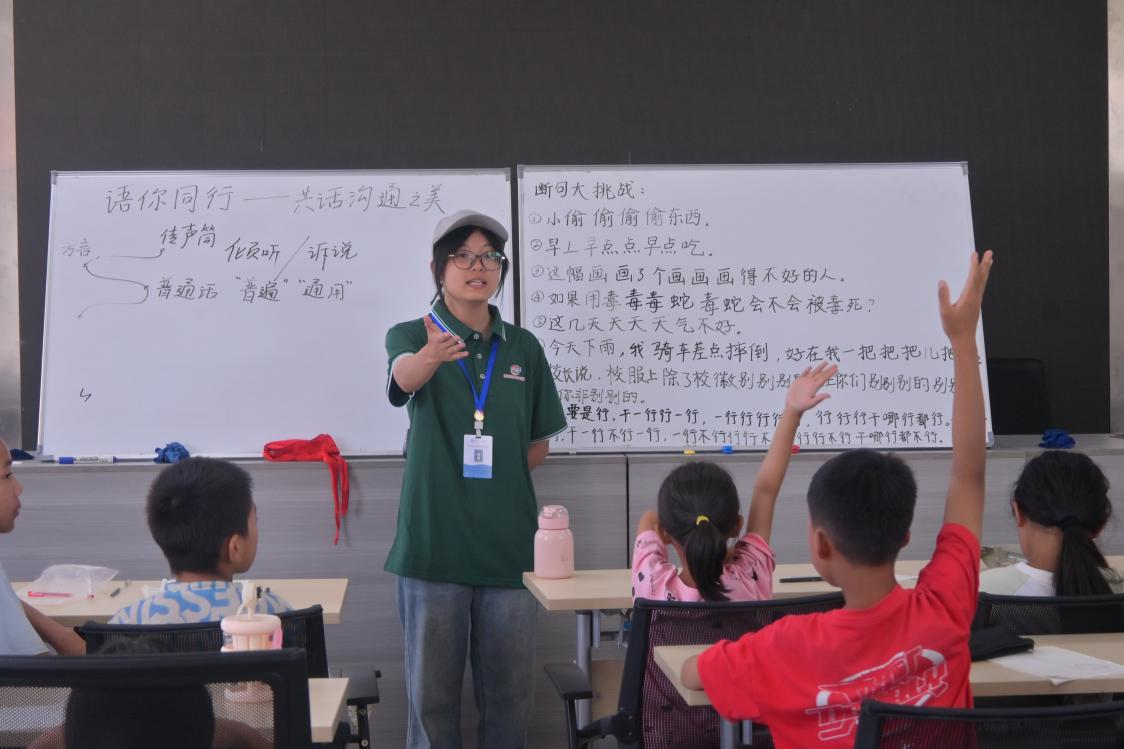 课堂上,来自广东的成员一开口,“我喜欢你”便成了孩子们模仿的焦点;用河南话讲出“排场”一词,惹得孩子们竞相猜测含义;山东腔刚起,“我”变“俺”的瞬间,就逗得孩子们笑弯了腰。这些带着家乡味的“小误会”,让孩子们恍然明白:“原来各地话差别这么大,说好普通话才能畅快聊天!”