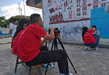 7月9日上午,一张蓝色背景布出现在澎湖小学的走廊尽头。背景布前是一张小板凳,小板凳上坐着的是正在测试拍照效果的“红烛”科普筑梦团队的老师们。
