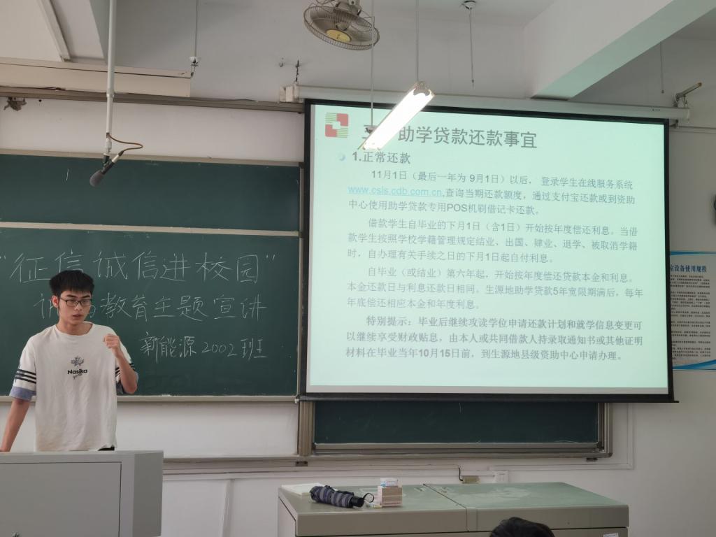 活动由各班级自行组织学生开展主题班会,充分利用国家开发银行制作的“征信知识进校园”诚信征信PPT及相关资助政策信息,向学生普及征信知识、强调诚信的重要性。班会宣讲内容包括国家开发银行简介、国家助学贷款简介、助学贷款还款事宜、诚信及个人征信、相关注意事项等。
