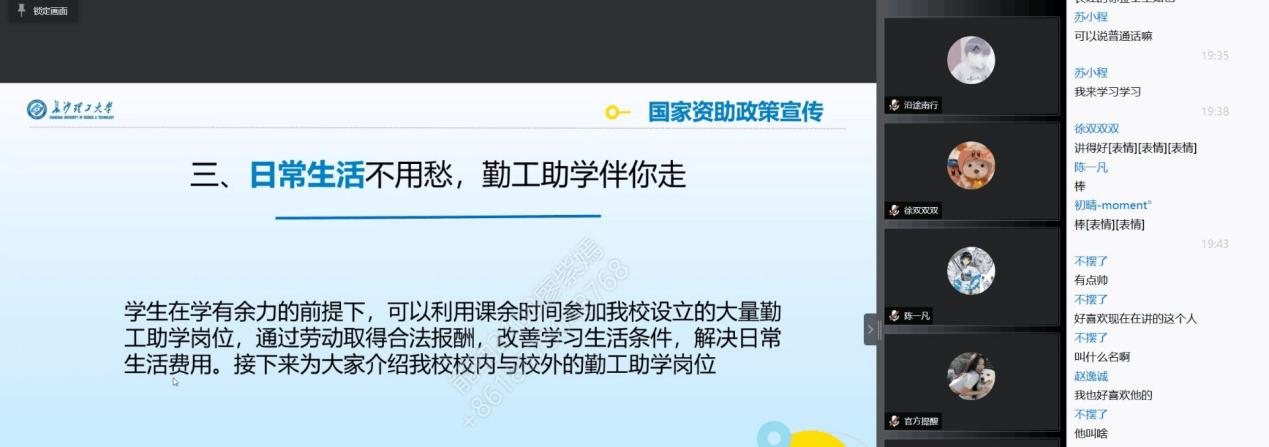 在湖南省汨罗市第一中学,能动2109班的廖紫嫣同学结合学弟学妹们的实际情况采取了线上会议的形式,从国家助学贷款、学费缓交、绿色通道、入学后的奖助学金和勤工助学等方面详细介绍,让同学们更加全面地了解国家资助政策。