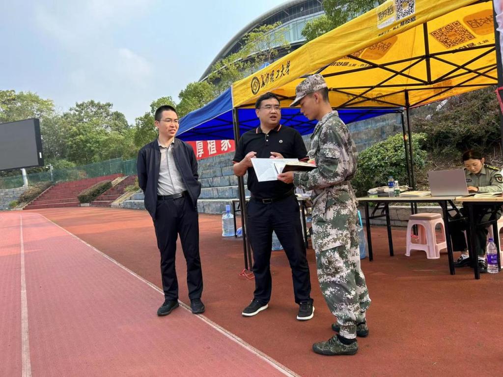 为全面了解23级新生军训情况与思想动态,鼓舞军训士气,确保军训正常有序进行,10月10日上午,能动学院党委书记成华、院长陈荐、党委副书记张晓烽、副院长田红 贾传坤、学工办老师李觅、胡雅妮、冯译萱前往云塘校区田径场慰问23级军训新生与15位带训教官,学院连队干部陈颖、罗亦欧、彭博陪同。