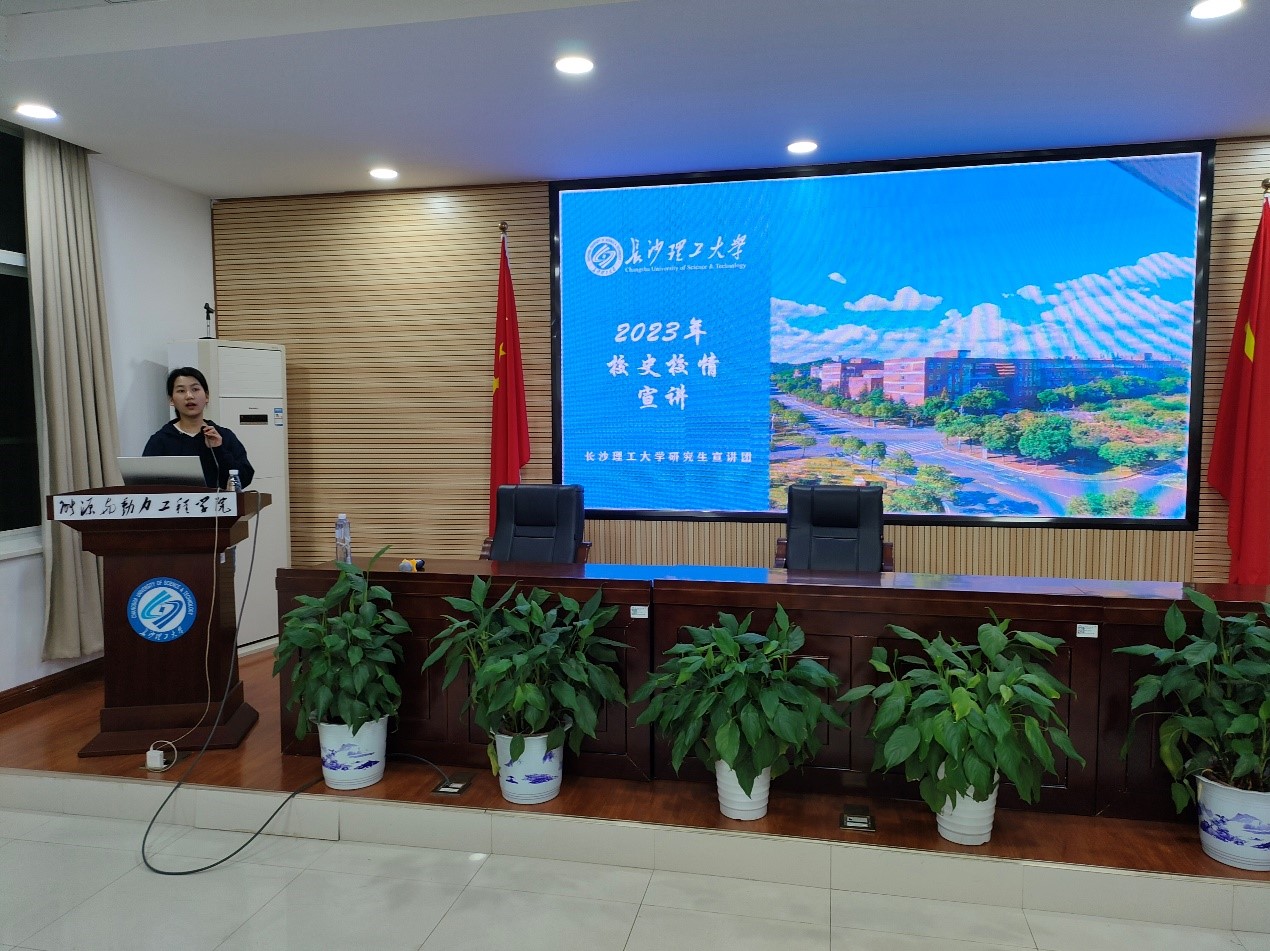 梁欣怡介绍了长沙理工大学办学历史、定位与特色,分别对校徽的含义、长理激流勇进20载进行了详细讲解,让同学们对学校有了更深刻的认识。梁欣怡分享了周骞老师的感人事迹,激励同学们要思考读研的意义,珍惜光阴,不负韶华。从朱定校友的分享中,让同学们知道如何切身践行对长理“脚踏实地、艰苦奋斗、乐于奉献、锐意进取"的铺路石精神。最后,宣讲现场还设置了“长理校史知多少”的互动问答环节,宣讲人与同学们进行热情互动,轻松活跃的答题氛围中,让同学们进一步加深对校史、校训、校情的了解。