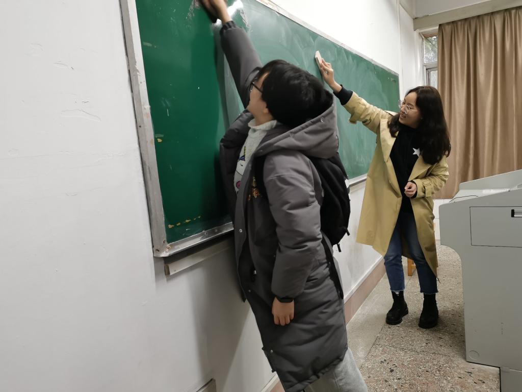 3月5日中午,院青志团组织了19名志愿者在长沙理工大学金盆岭校区13号教学楼前集合,对13号教学楼一层进行清扫。青志团成员将19名志愿者进行了简单分组,确保每一个教室都有至少3名同学在清扫。明确各自的任务后,志愿者们迅速开始行动。部分桌椅下的地面有很多细小的垃圾,清洁空间又比较狭小,志愿者们弯着腰仔细清扫,有的甚至钻到底下去,不放过每一个缝隙。
