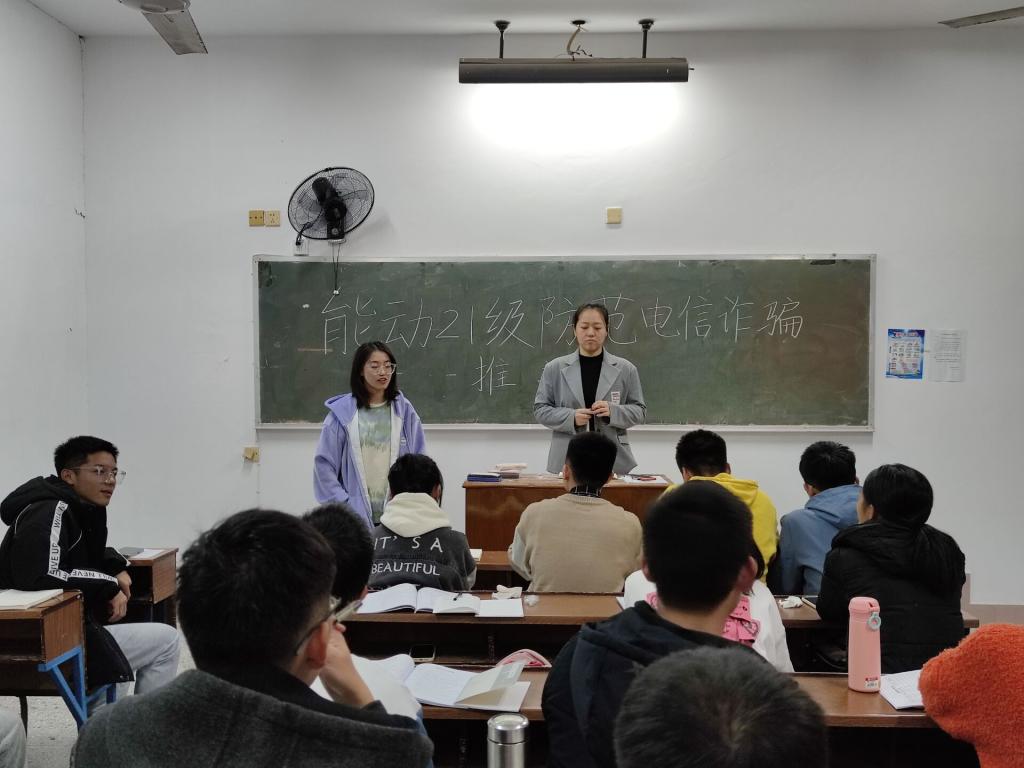 为进一步提高同学们对电信网络诈骗的防范意识,能动学院于11月25日晚上在金盆岭校区四教开展21级防范电信诈骗教育推进会,会议由年级辅导员罗亦欧主持,21级全体主要学生干部参会。