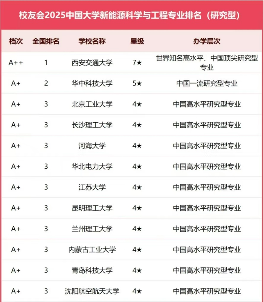 中国校友会榜单显示,长沙理工大学位居2025中国大学新能源科学与工程专业排名(研究型)第四名。