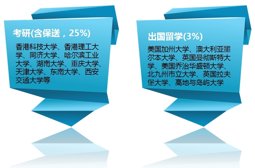 每年都有一批学生考取同济大学、西安交通大学等知名大学的研究生和赴海外著名大学美国加州大学、澳大利亚墨尔本大学、英国曼彻斯特大学等留学。