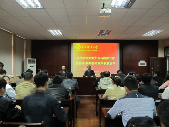 4月12日下午,加拿大注册高级能源工程师,国际知名能效评价专家,福斯特能源公司总裁彼特龙.福斯特(Peter B.Ferst)先生应邀来长沙理工大学访问,并在工科一号楼能动学院多功能报告厅做了题为《能效提升与雾霾治理》的学术报告。此次报告会受到相关政府部门和企业的高度关注,长沙市工信委、长沙市能源局及下属的各区县、各园区和有关企业的领导和能源工作者50多人参加了报告会。能动学院相关领域的教授、博士和学生聆听了此次报告。报告会由能源与动力工程学院院长陈冬林教授主持。