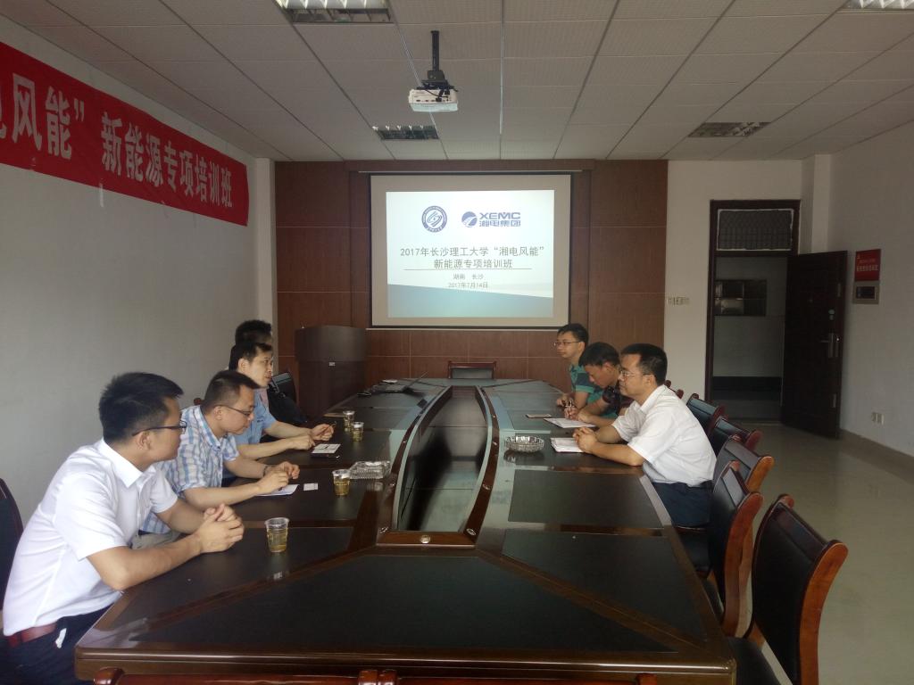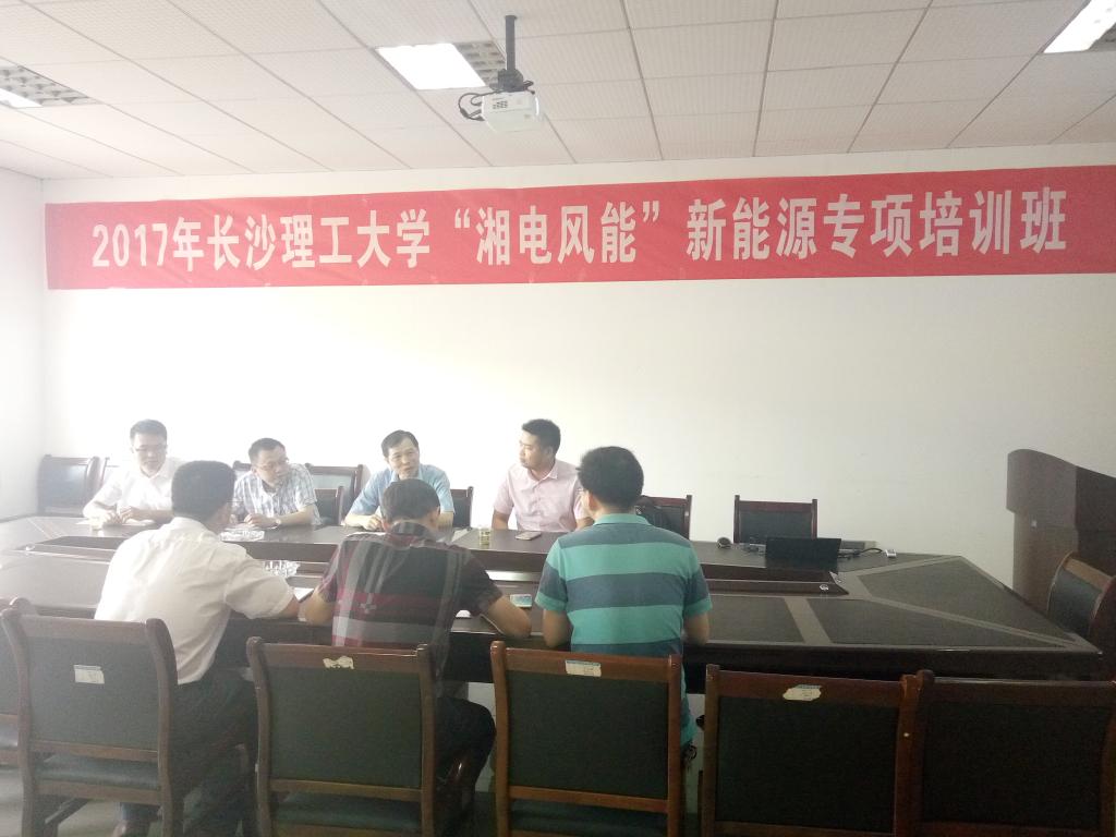 2017年7月14日,2017年长沙理工大学“湘电风能”新能源专项培训班开班仪式在我院工科一号楼A422室举行,湘电风能龙辛技术副总、吴晓鹏副院长、刘自强副部长、王成泽工程师、我院陈荐院长、田向阳副书记、唐明珠副主任及新能源科学与工程专业的部分本科生参加开班仪式。长沙理工大学“湘电风能”新能源专项培训班目的是湘电风能选拔2014级新能源专业本科生参加风资源评估工程师培训,实现学校人才培养和企业人才需求无缝对接。