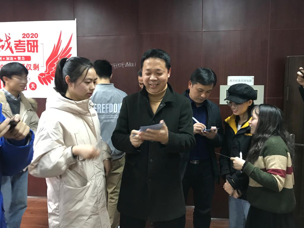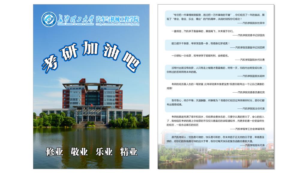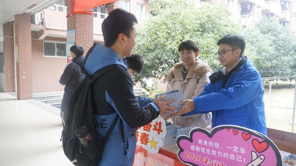 在寝室楼下,在考研教室,在图书馆,处处可见汽机学院师生为考研学子送祝福的场景。“天道酬勤,祝大家梦想成真!”12月19日,长沙理工大学汽机学院院长杜荣华、党委书记邱国良带领全体院领导、学生辅导员将学院精心筹备的234余份考研专属“五福袋”送到备考学子手中。